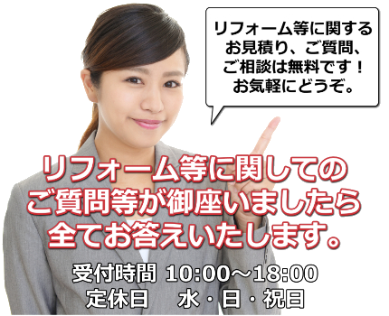 リフォームの場合は、個々の住まいの状況を実際に見て確認しないと正確な金額が出ないケースが多いですし、いい提案やプランもできません。見積り後に断っても構わないのですから、積極的に御相談なさってください。